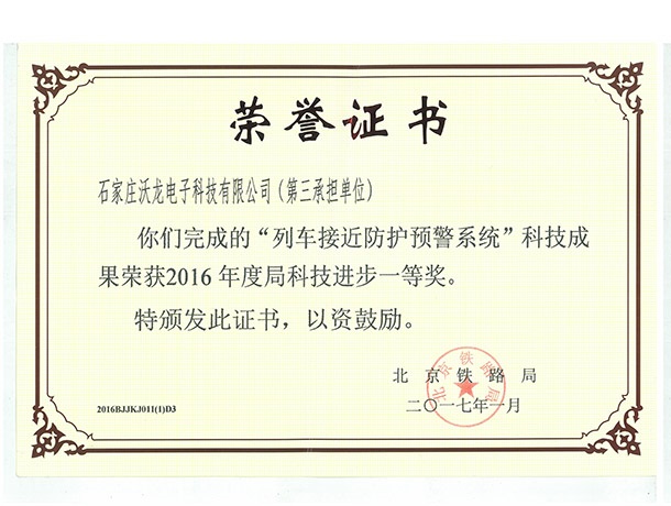 我司“列車接近防護(hù)預(yù)警系統(tǒng)”榮獲中國(guó)鐵路北京局集團(tuán)有限公司2016年度科技進(jìn)步一等獎(jiǎng)。